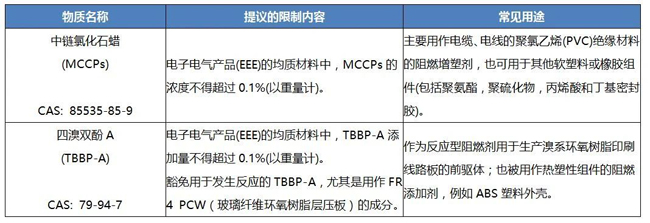早在2018年啟動的歐盟RoHS指令評估項目Pack15就提議將鈹及其化合物、5種鈷鹽、三氧化二銻、磷化銦、中鏈氯化石蠟、硫酸鎳和氨基磺酸鎳、四溴雙酚A共7項物質(zhì)納入RoHS指令附件II限制物質(zhì)清單,經(jīng)過一段時間的公眾咨詢和項目評估,最終提議將中鏈氯化石蠟(MCCPs)和四溴雙酚A(TBBP-A)納入清單,其他5項物質(zhì)暫不考慮納入。